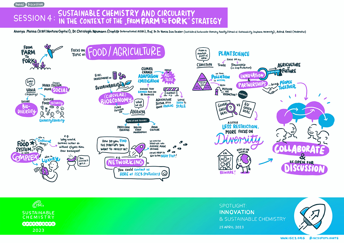 Session 4 of the ISC3 SPOTLIGHTS focused on Sustainable Chemistry and circularity in the context of the "From Farm to Fork" strategy. The discussion was led by Prof. Dr. Dr. Vania Zuin Zeidler, Ananya Manna, and Dr. Christopher Neumann, and moderated by Astrid Ewaz (ISC3).