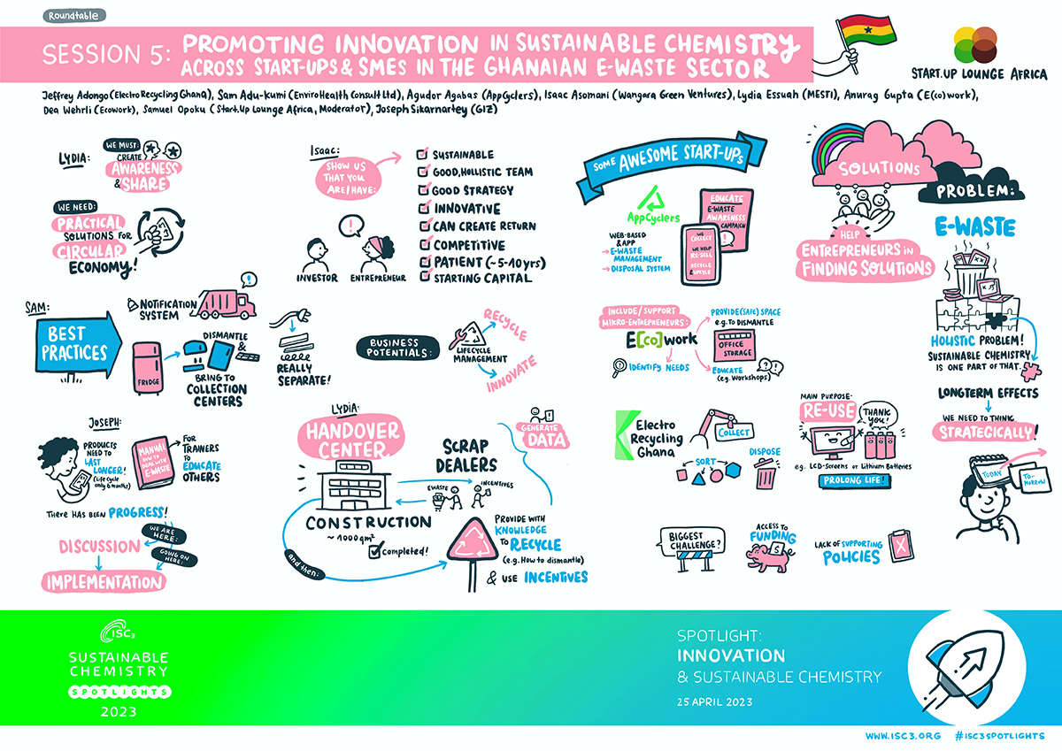 During Session 5 of the ISC3 SPOTLIGHTS event series, a roundtable discussion was held on promoting innovation in Sustainable Chemistry for start-ups and SMEs in the Ghanaian E-waste sector. The objective was to highlight actions being taken to promote and implement Sustainable Chemistry and solutions for E-waste across different stakeholders, including policymakers, entrepreneurs, and academia. The event sought to foster a common understanding of Sustainable Chemistry and E-waste and showcase local and international innovations that support the implementation of the 2030 Sustainable Development Agenda.