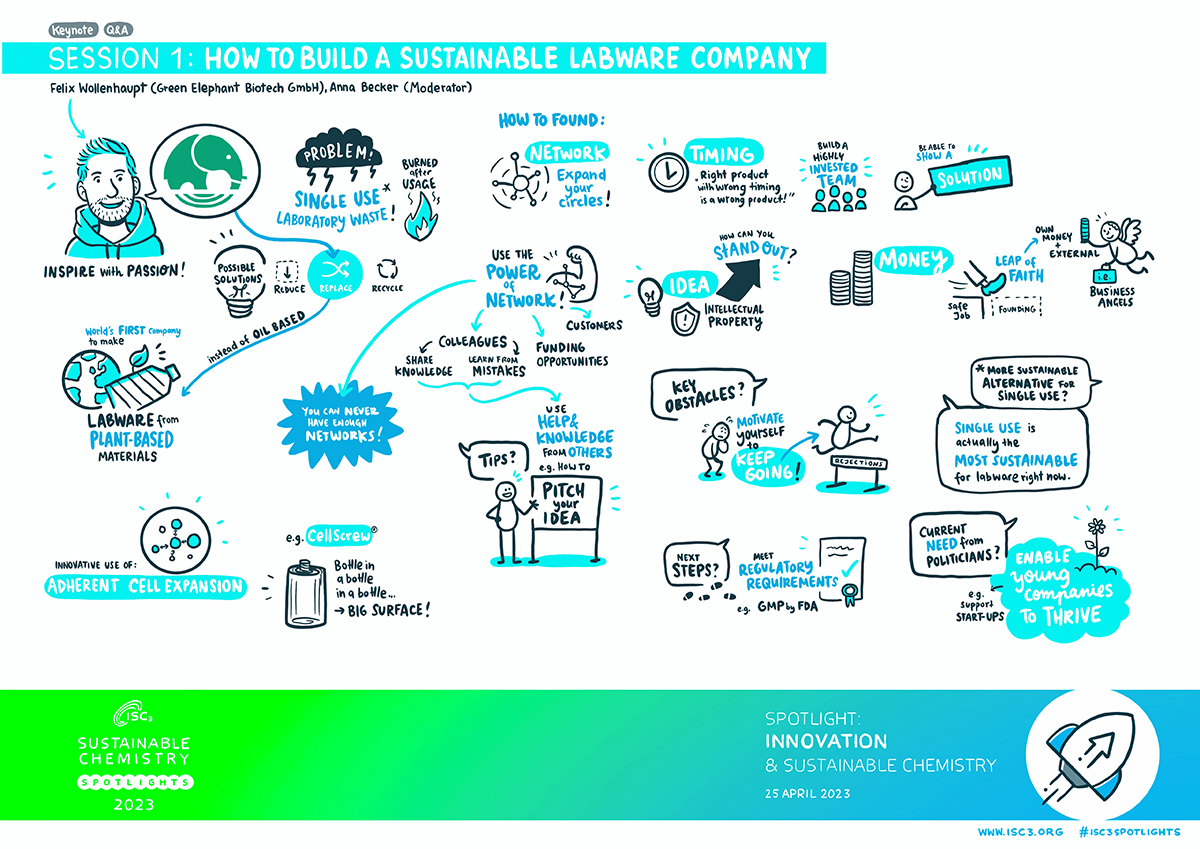 The first session of the ISC3 SPOTLIGHTS was kicked off by Felix Wollenhaupt, and was moderated by Anna Becker (ISC3). Felix Wollenhaupt is the co-founder of the German company Green Elephant Biotech GmbH, which is the world’s first company to make labware from plant-based materials. Felix Wollenhaupt shared his journey and provided information on building a company, including advice on how to find the best business partners, raise capital, build a team, and create a business plan. Moreover, he offered insight into potential challenges that entrepreneurs may face during their journey and how to overcome them.