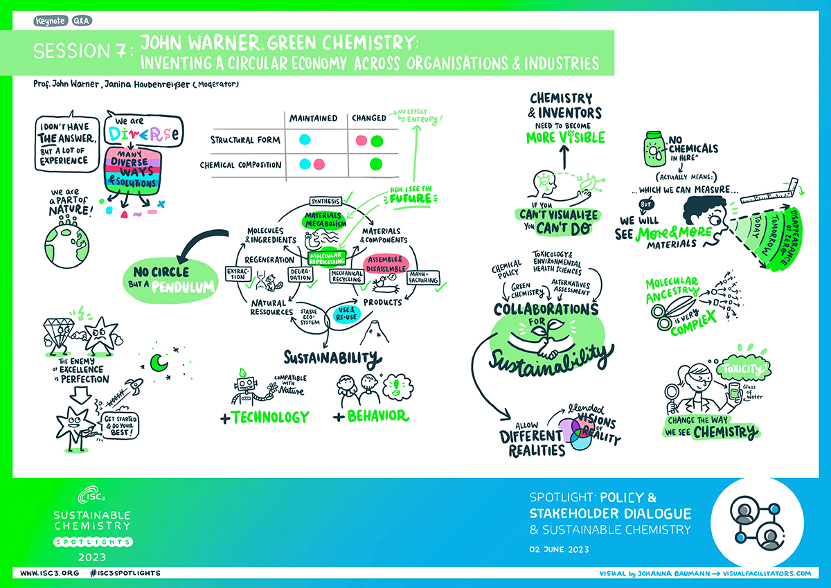 The last session on day four of the SPOTLIGHT event series was on "Green Chemistry: Inventing a Circular Economy across organisations and industries" and presented by John Warner, one of the co-founders of the field of green chemistry. The session was moderated by Janina Haubenreißer (ISC3).