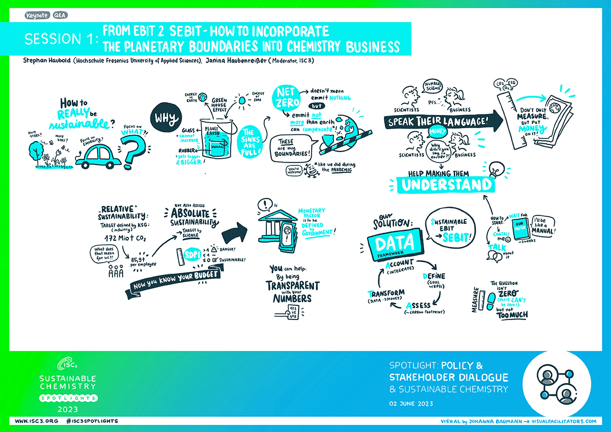 The first session on our SPOTLIGHT: Policy & Stakeholder Dialog "From EBIT 2 SEBIT – How to incorporate the planetary boundaries into chemistry business" was presented by Professor Stephan Haubold, who is a Professor for Business Chemistry at Hochschule Fresenius University of Applied Sciences. The session was moderated by Janina Haubenreißer (ISC3).